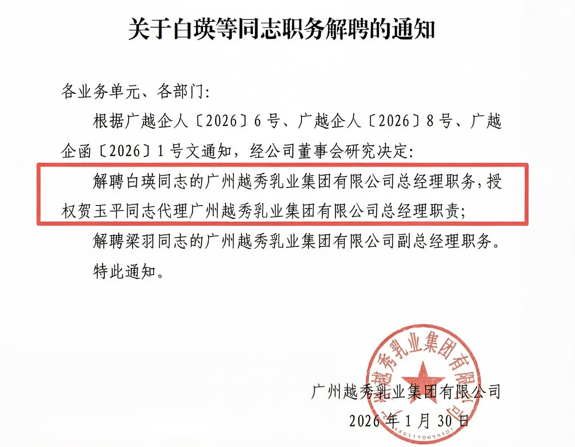 近日,据多家权威媒体报道,原蒙牛创业元老、越秀乳业副董事长兼总经理白瑛已离任。网上流传的一则落款时间为2026年1月30日的越秀乳业内部通知显示:经公司董事会研究决定,解聘白瑛的广州越秀乳业集团有限公司总经理职务,并由贺玉平代理总经理职责。同时被解聘的还有副总经理梁羽。