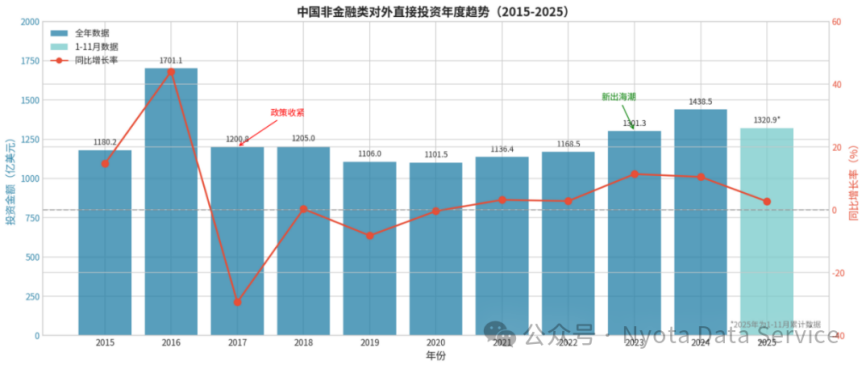 据公众号Nyota Data Service的统计,自2025年起,非金融类直接投资增速有放缓的迹象。