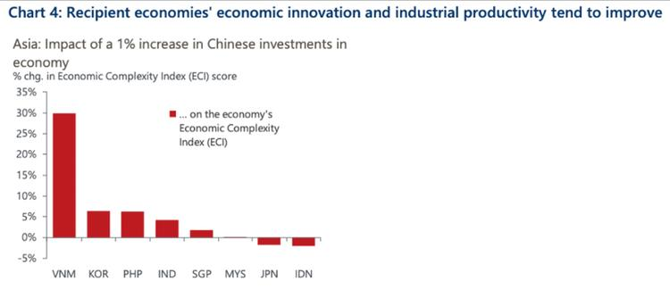 和日韩一样,中国资本流入会拉动被投资国的生产效率和技术创新。一份研究显示,中国投资每增加1%,越南的经济复杂度指数(ECI)最高增加30%。