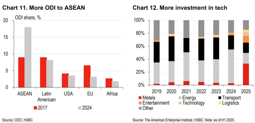 据汇丰等机构的统计,中国对东盟主要经济体的投资快速增长。2010年前后不足50亿美元,2024年超过320亿美元,对外投资占比从不到10%提高到接近20%。