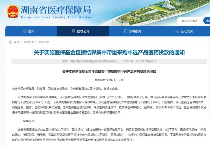 就在几天前,湖南省医保局网站公开了《关于实施医保基金直接结算集中带量采购中选产品医药货款的通知》,明确自2023年10月1日起,在全省范围内实施集中带量采购中选药品和医用耗材货款由医保基金直接结算工作。